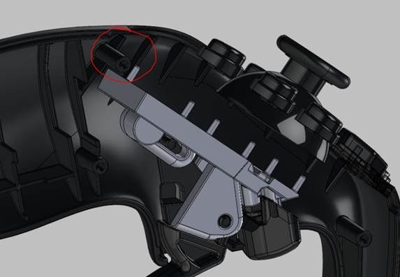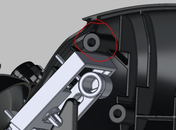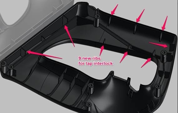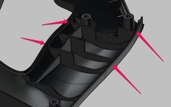 The fix that is proposed, and that we will be implementing, incorporates two modifications. The first mod, shown in the images below, is the addition of a screw boss near the thumb area where we were experiencing some inconsistency in the reveal gap.
